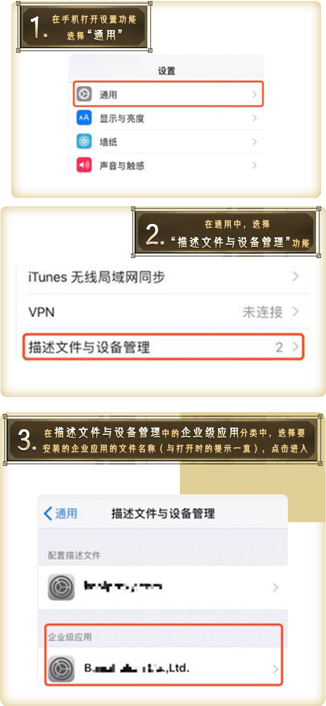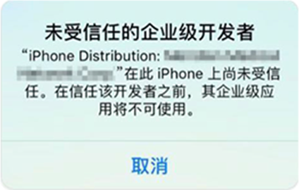 因苹果公司的政策原因,在IOS系统中首次安装企业版应用时会出现“未受信任的企业级开发者”提示