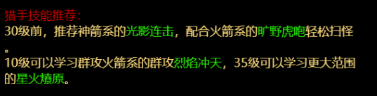 30级前,推荐神箭系的光影连击,配合火箭系的旷野虎咆轻松扫怪。