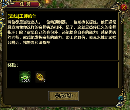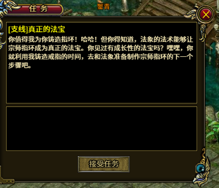 被王师认可后,他会推荐你结识赤水城的蟹青、法象。蟹青、法象告诉你,他们可以做宗师指环,但是需要一些材料。