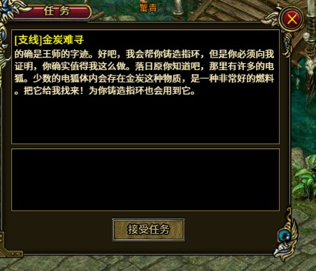 根据蟹青的指引,来到赤水城外的落日原,开始寻找第一种材料——金炭。在所有新推出的怪物中,落日原电狐的实力确实不容小觎,而金炭的掉率实在是不高。想得到宗师指环,就要做好持久战的准备。