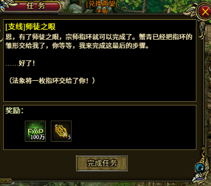 将好不容易获得的金炭交给蟹青后,法象又出了一个难题,要你寻找另一个材料——师徒之眼。并指示了获得师徒之眼的方法。不过在赤水以南龙门渡谷鱼精据说有机会获得这种晶石。