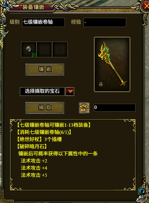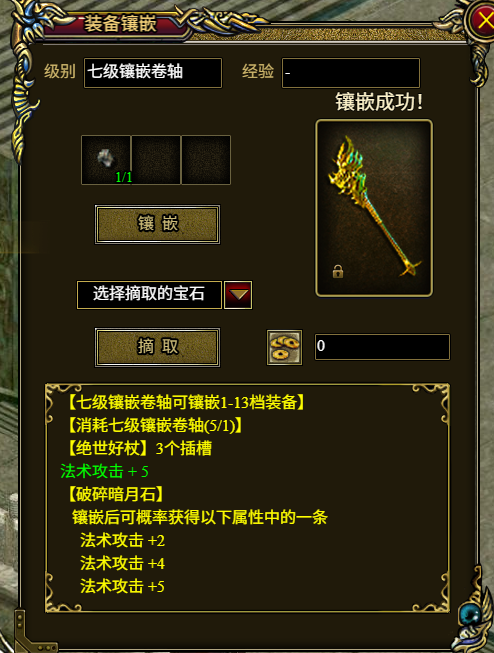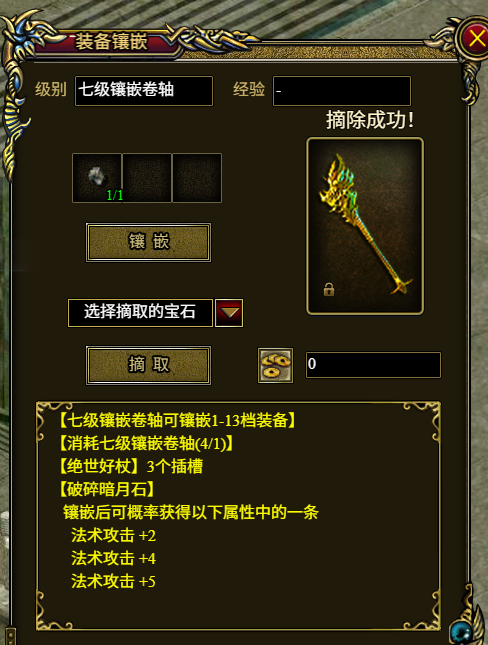 注意:摘取并不能把宝石摘下来,只是会还原1个凹槽,镶嵌在装备上面的宝石将会消失掉。
