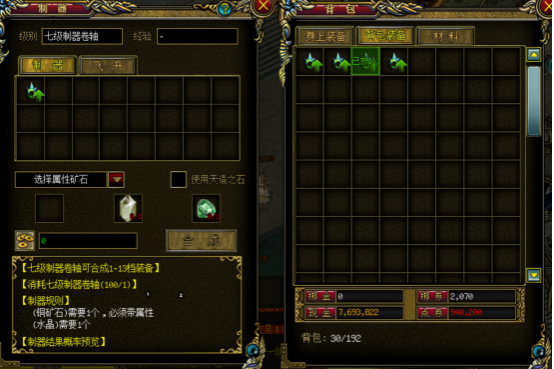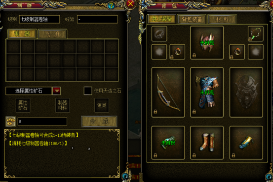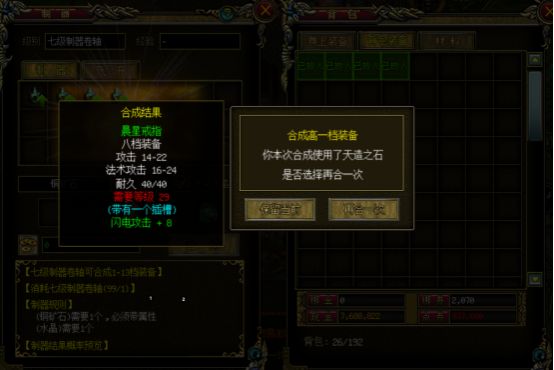 4、同一属性的装备合成,新装备获得的属性有概率获得提升 合成结果 产生高一档装备、产生同档小极品、产生同档次装备、产生低一档装备、装备消失